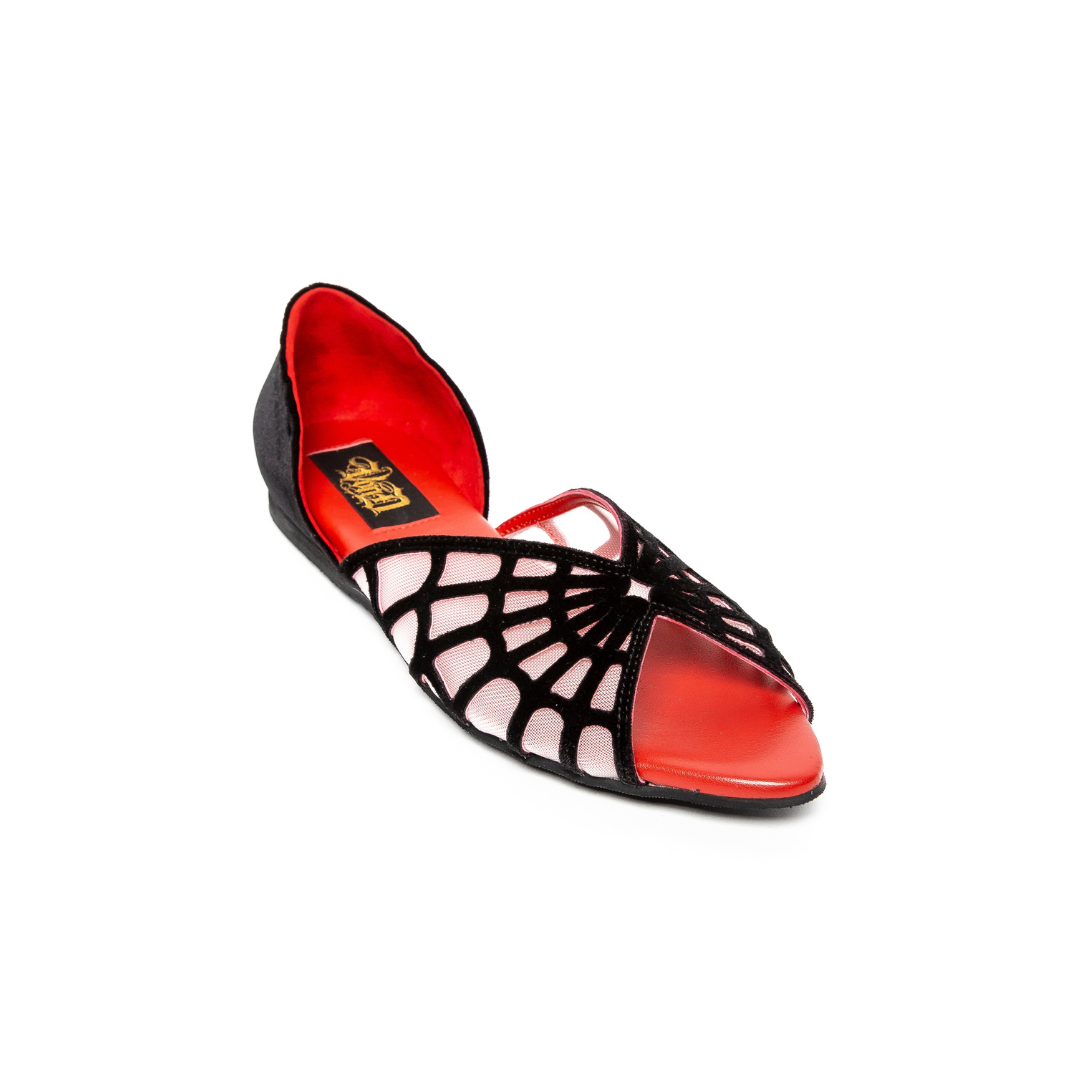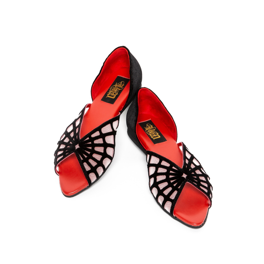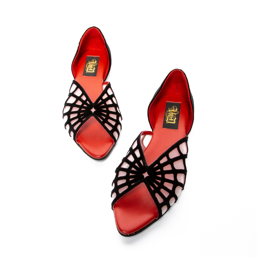- Crafted in Italy with meticulous attention to detail, this flat features a luxurious black velvet exterior paired with a striking vegan red leather interior. The spider web design is reinforced with nude power-mesh lining for durability and structure. A sophisticated choice that combines ethical materials with refined Italian craftsmanship.